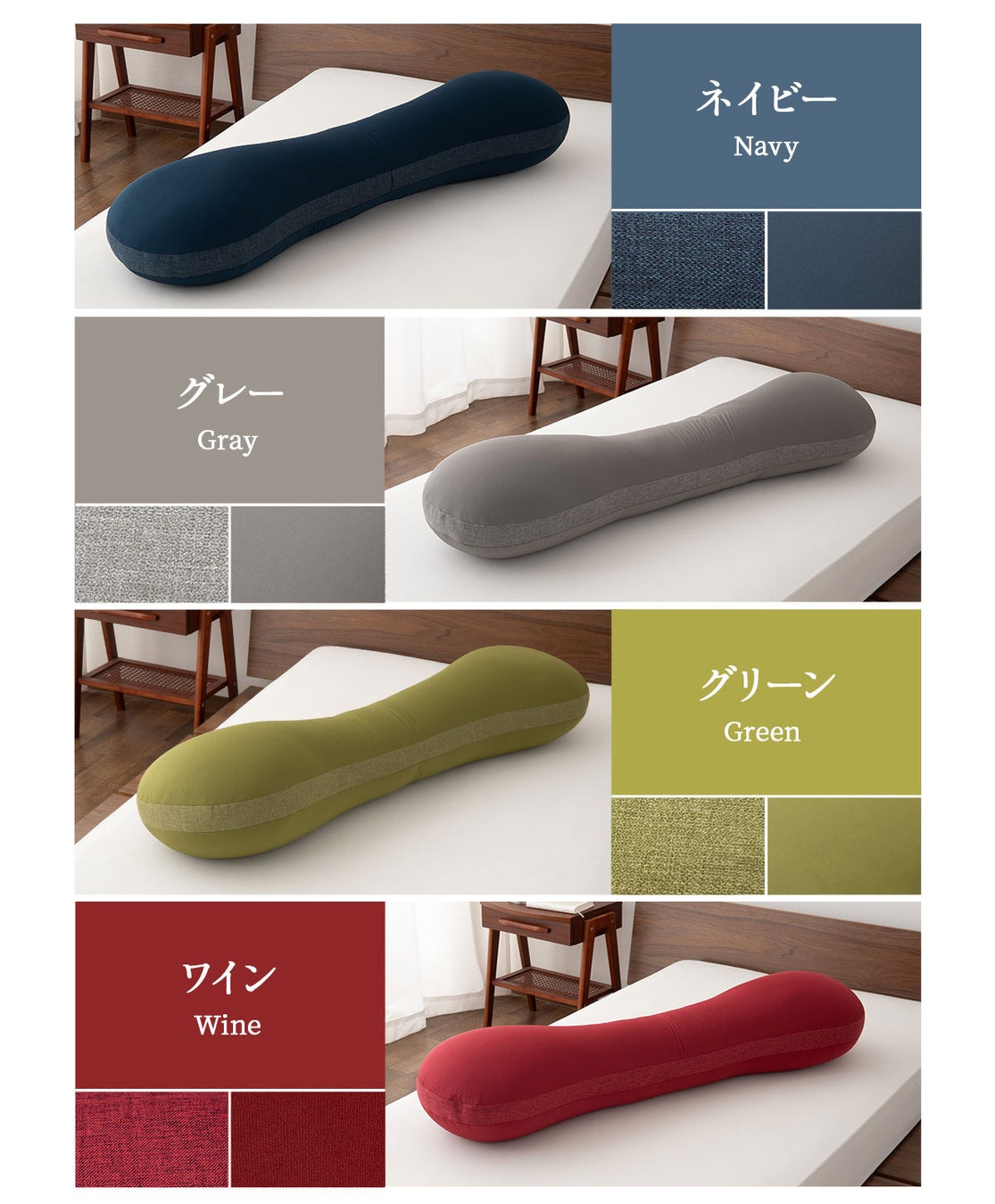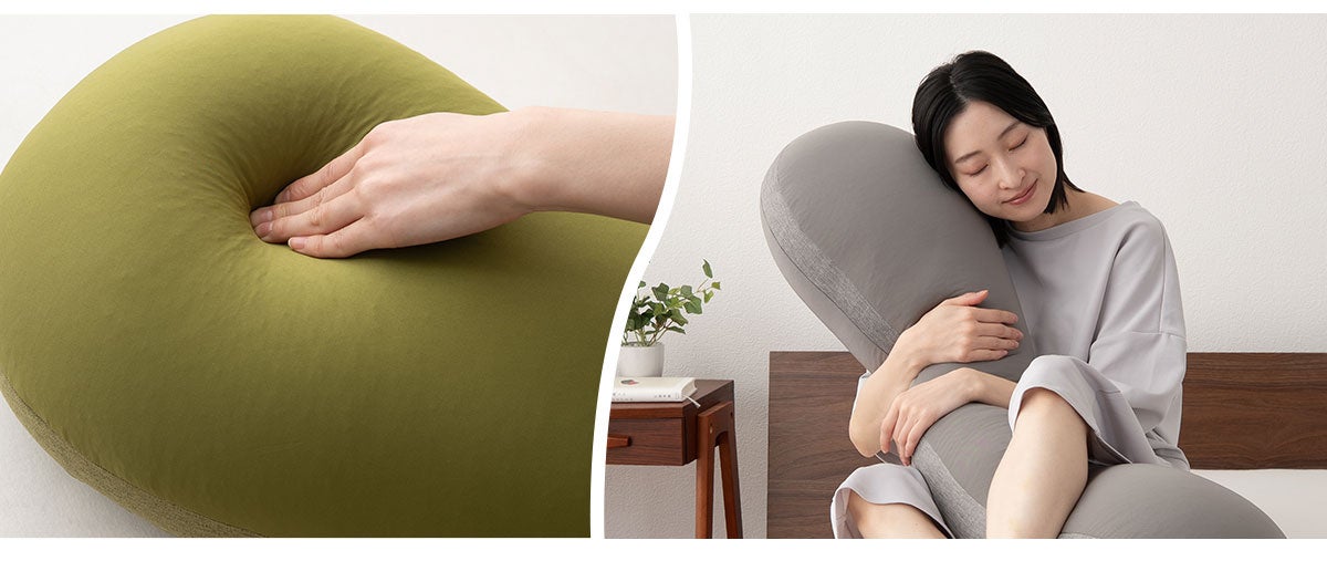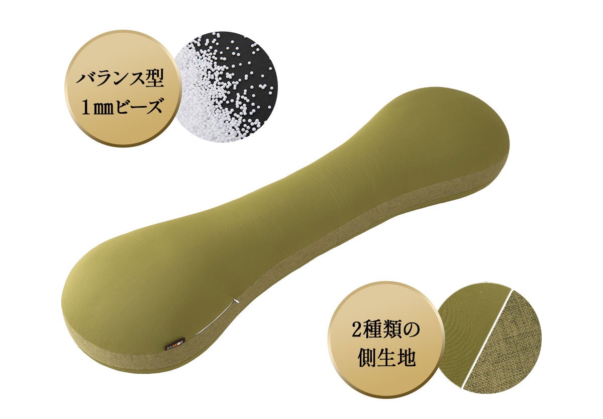 伸びる&伸びにくい2種類の生地を組み合わせ、柔らかな触感と中のビーズが流れすぎない安定感のある使い心地を実現。心地よさと機能性を両立しています。