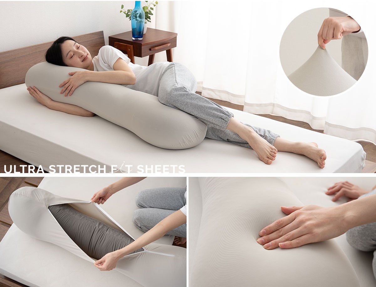 暑い季節でも快適に抱き枕を使いたい方に向けた専用カバーもご用意しました。伸縮性のある生地が抱き枕にピタッとフィットして、面倒なカバー交換もささっと完了!抗菌防臭機能付きで、ご家庭でお洗濯もできるので、毎日清潔に保てます。