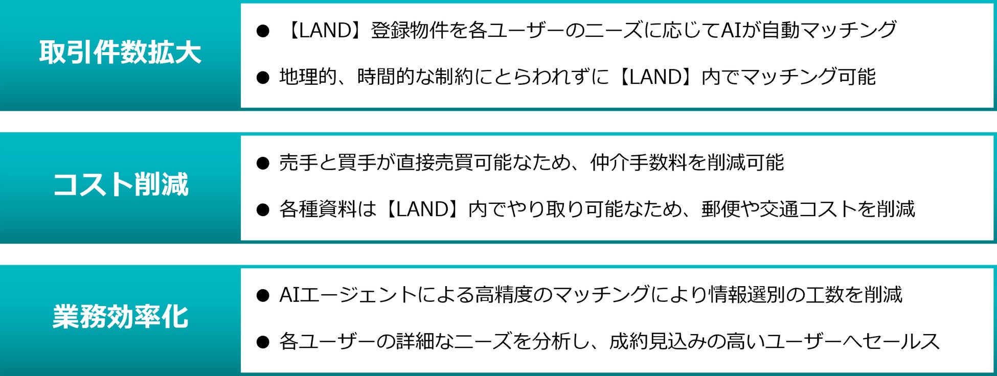 「ダイレクト売買」は、前記の「セールスZ」を搭載した、不動産売買における売手と買手双方のニーズを【LAND】プラットフォーム内でマッチングさせる機能です。これまで、遠隔地であるがためにネットワークを持たなかった事業者や、物件資料の作成・送付に時間を要することで取引機会が見送られたケースについて、本機能では【LAND】に登録された物件情報をもとに「セールスZ」が売買ニーズを高精度にマッチングさせることで、地理的、時間的な制約を克服し、【LAND】ユーザー間の取引件数の拡大を実現いたします。さらに、売手と買手が直接取引できるようになることで、仲介手数料の削減や取引期間の短縮といった効果も期待できます。