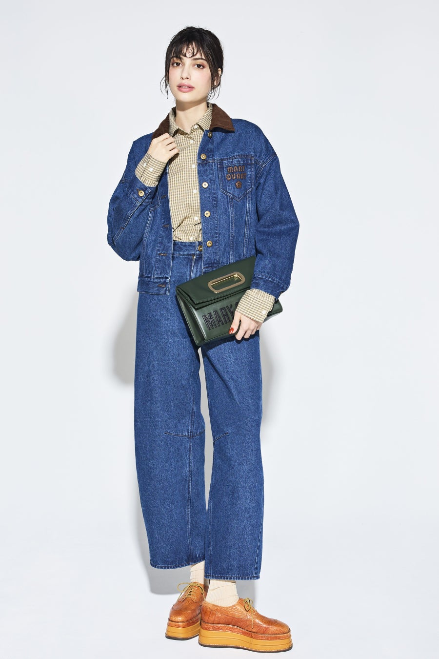 デニムのセットアップにチェックシャツを合わせてカジュアルなマニッシュコーデに。