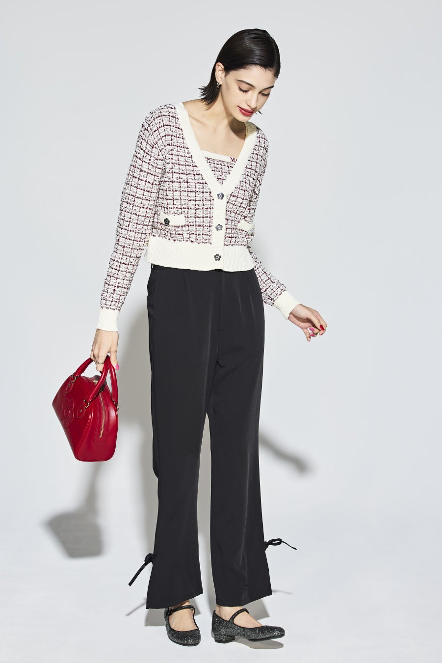 ラメ入りのツイードニットが目を惹く、アンサンブルビスチェ&カーディガン。深みのあるミニボストンがアクセント。