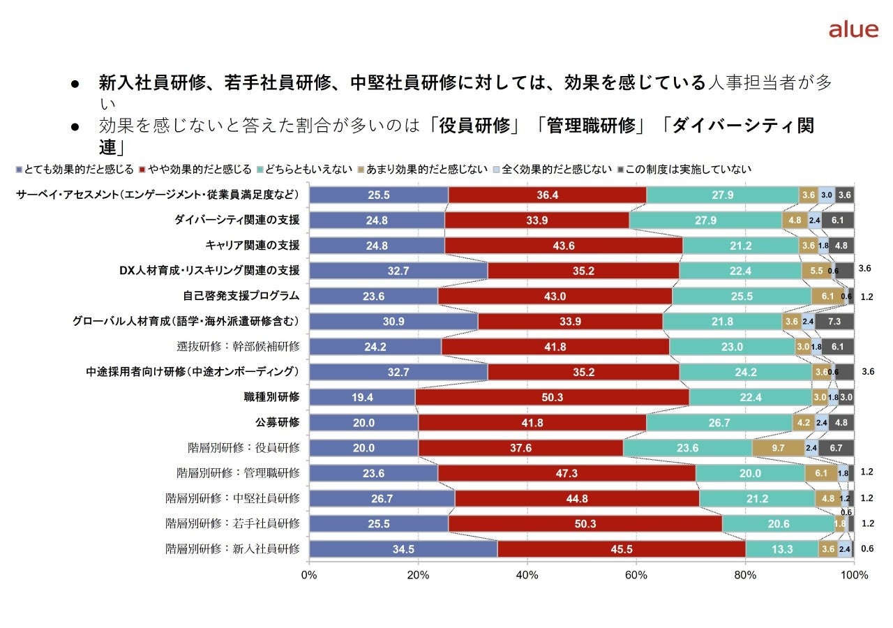 新入社員研修、若手社員研修、中堅社員研修のほか、DX人材育成・リスキリング関連研修についても、実際に効果を感じている