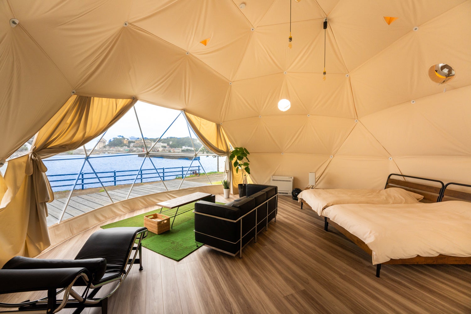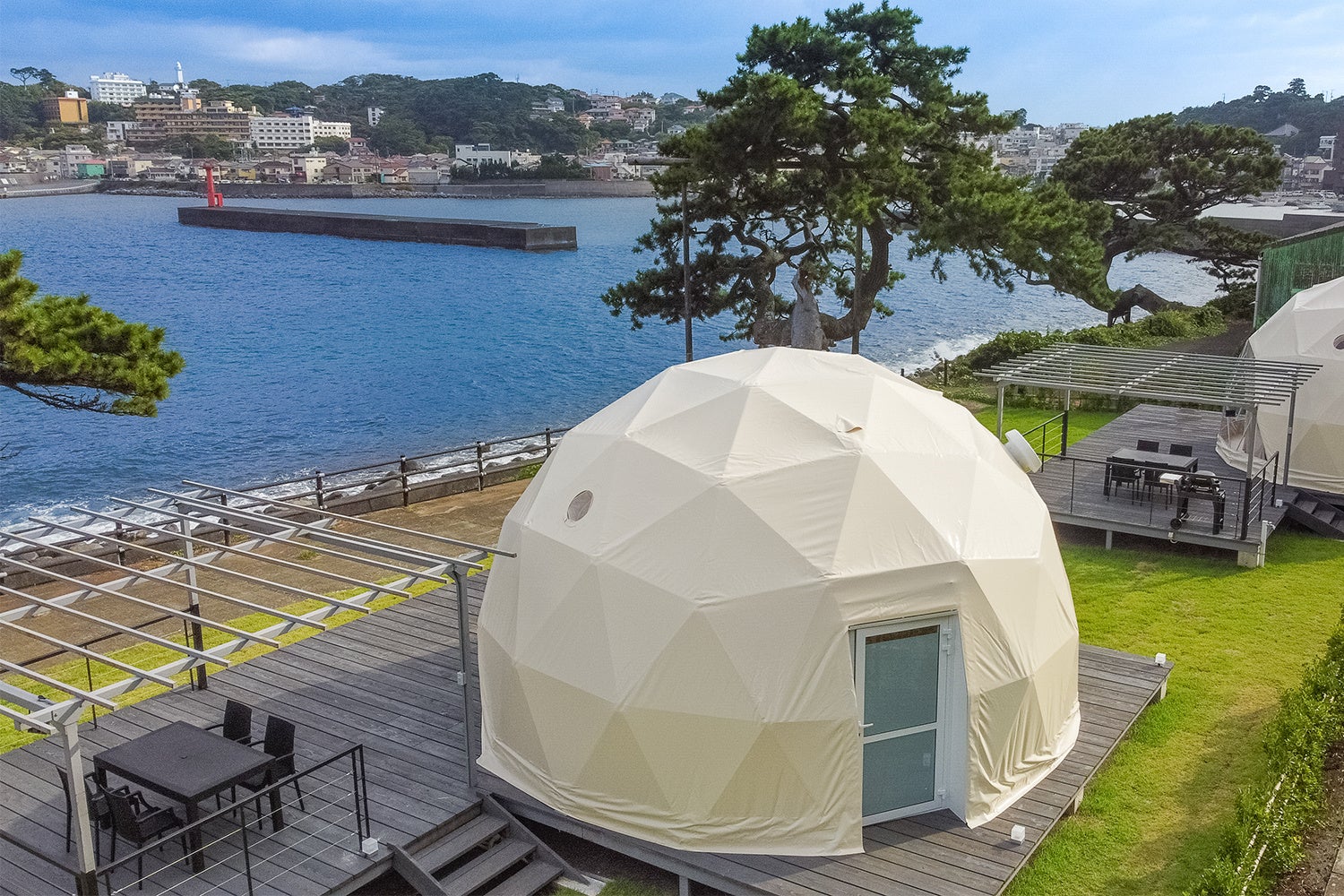 伊豆の真っ青な海に面する好立地に雨や風に強く、可愛いフォルムで大人気のドーム型テント2棟を配置。約38㎡の大空間が広がる1棟貸切タイプのドーム型テントは、冷暖房完備で一年中快適にお過ごしいただけます。テントに隣接して波の音や潮風が心地よい専用の絶景テラスを完備。