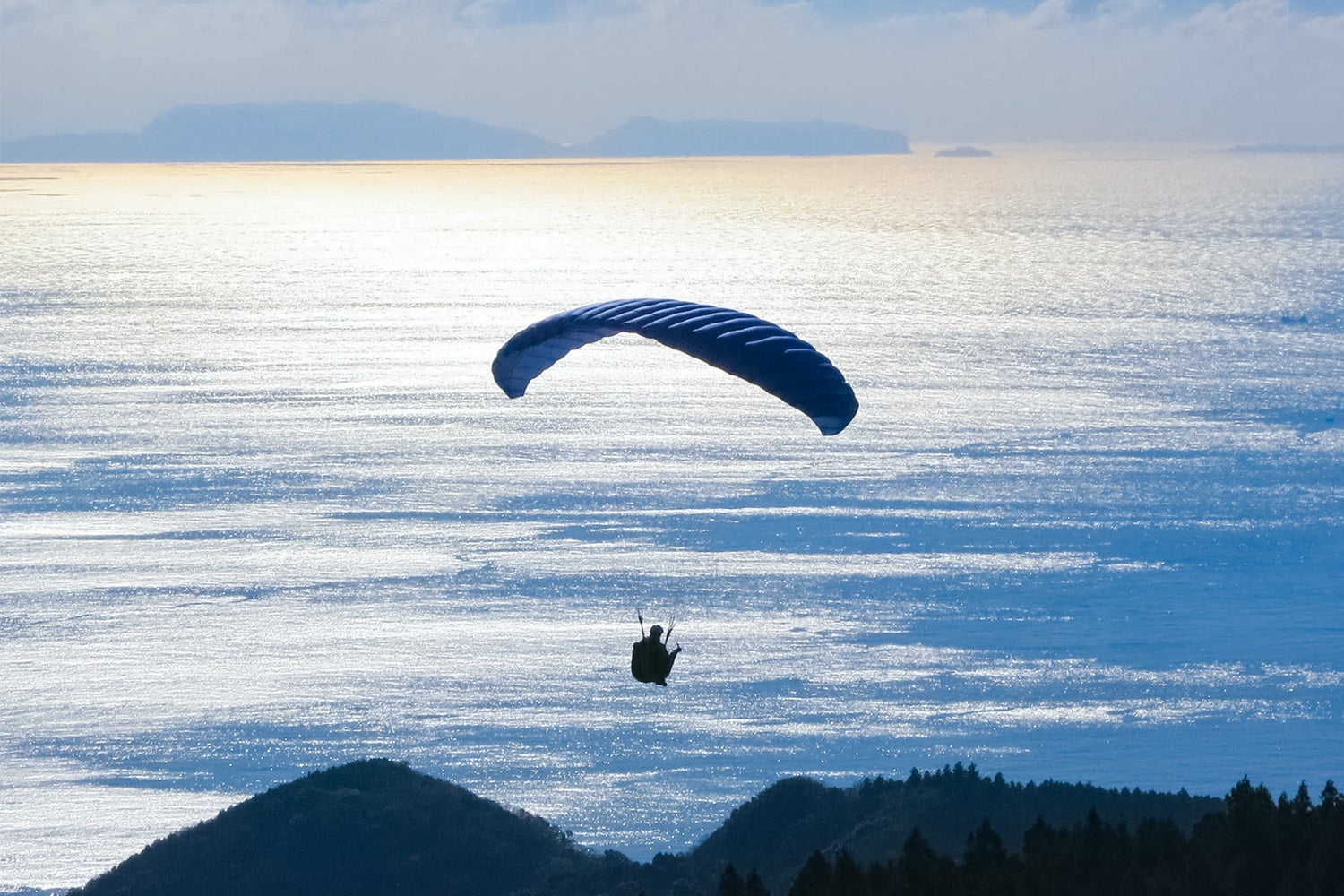 ⑥大空を翔るパラグライダー。伊豆半島を満喫するアクティビティ