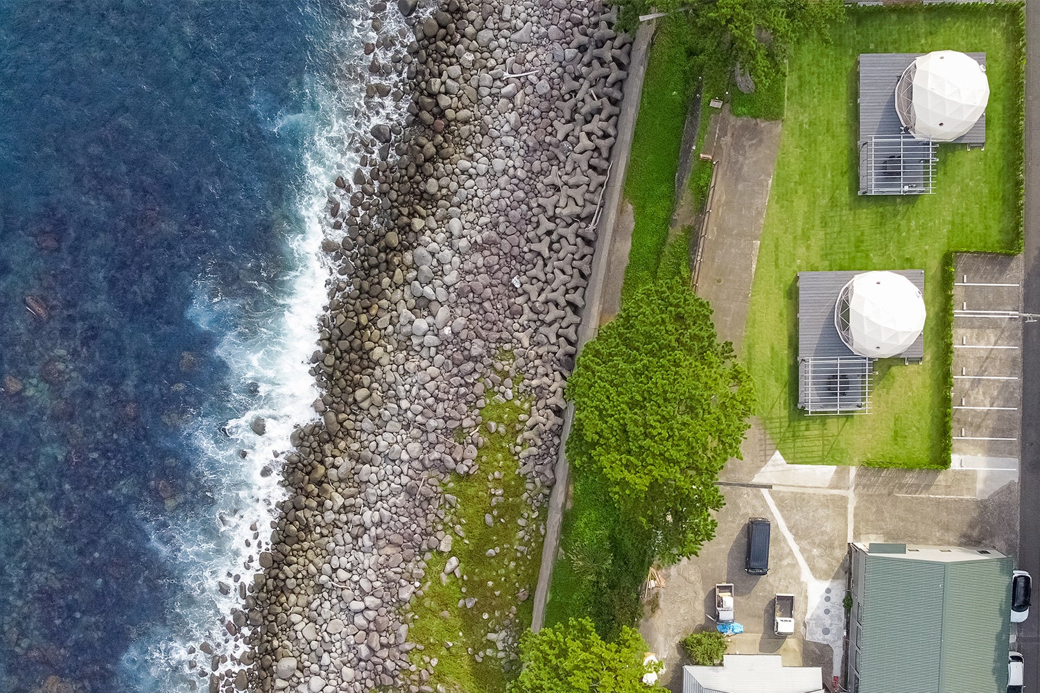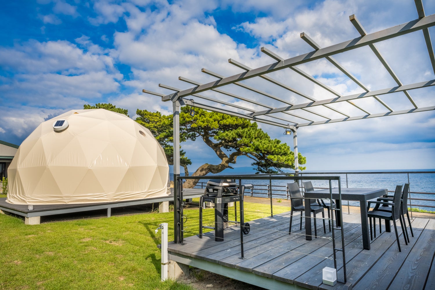 目の前には太平洋の水平線を臨む海の情景。各ドームテント専用の絶景テラスで寄せては返す波音をBGMに過ごすプライベートステイ。