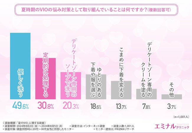 そこで、「夏時期のVIOの悩み対策として取り組んでいることは何ですか?(複数回答可)」と質問したところ、『優しく洗う(49.6%)』と回答した方が最も多く、次いで『定期的に処理する(30.8%)』『デリケートゾーン専用のソープで洗う(20.3%)』となりました。