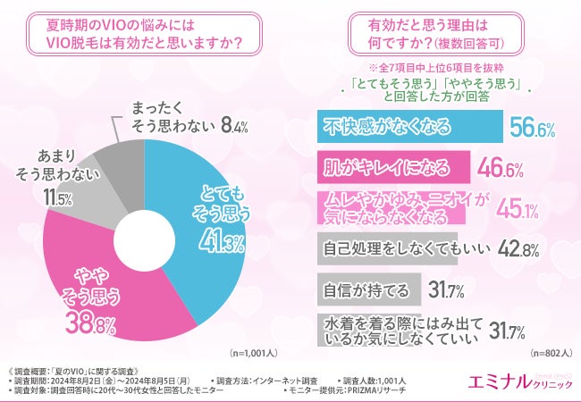 そのような夏時期のVIOの悩みに対してVIO脱毛は有効だと思う方が非常に多く、理由として不快感がなくなること、肌がキレイになること、ムレやかゆみ、ニオイが気にならなくなるといったことが挙げられました。