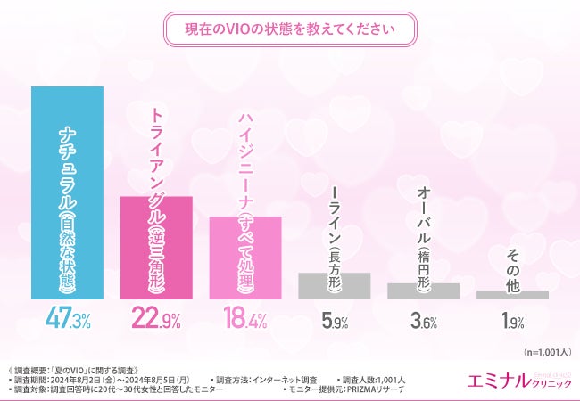 「現在のVIOの状態を教えてください」と質問したところ、『ナチュラル(自然な状態)(47.3%)』と回答した方が最も多く、次いで『トライアングル(逆三角形)(22.9%)』『ハイジニーナ(すべて処理)(18.4%)』となりました。