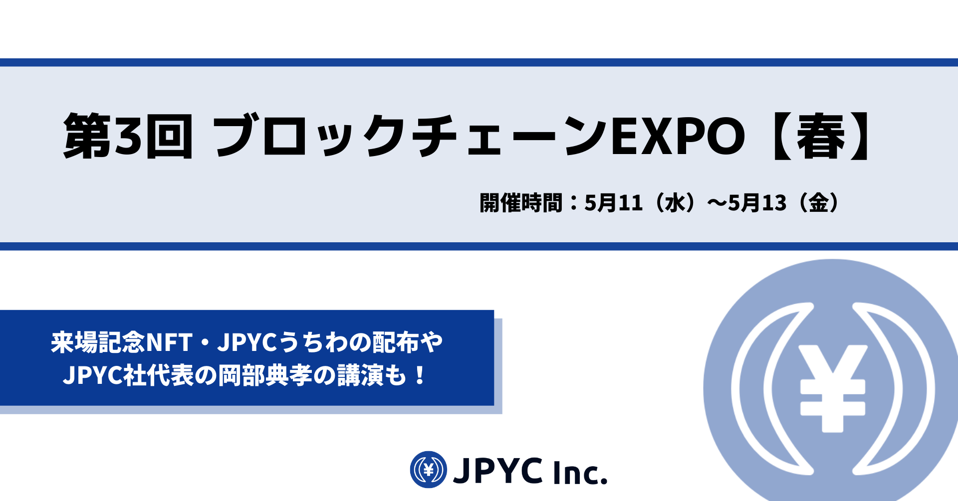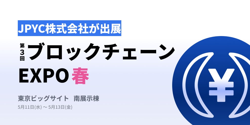 前払式支払手段扱いの日本円連動ステーブルコイン『JPYC』を取り扱うJPYC株式会社(東京都千代田区、代表取締役:岡部 典孝)は、東京ビックサイトで開催される国内最大級のブロックチェーン展示会「第3回 ブロックチェーンEXPO【春】」に出展をいたします。