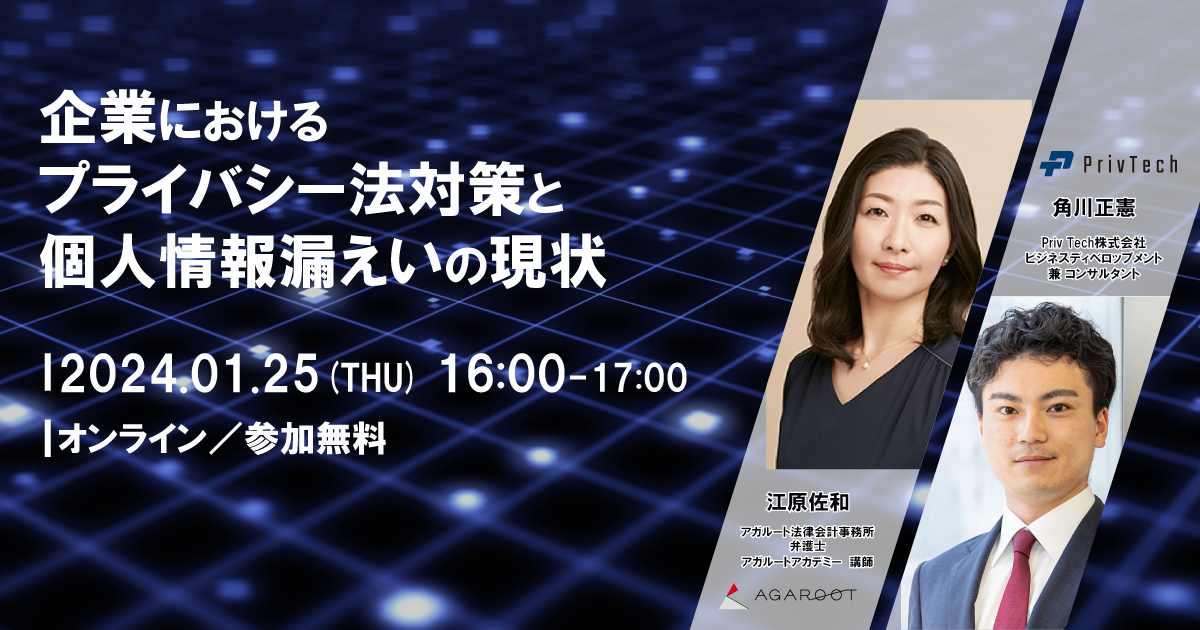 【共催Webセミナー】アガルート法律会計事務所× Priv Tech『企業におけるプライバシー法対策と個人情報漏えいの現状』1月25日(木)16時開催