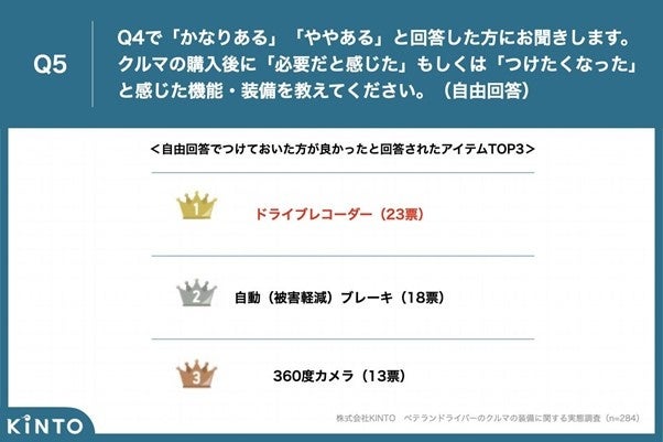 Q4で「かなりある」「ややある」と回答した方に、「Q5:クルマの購入後に「必要だと感じた」もしくは「つけたくなった」と感じた機能・装備を教えてください。」(n=284)と質問したところ、「ドライブレコーダー」や「自動(被害軽減)ブレーキ」「360度カメラ」など131の回答を得ることができました。