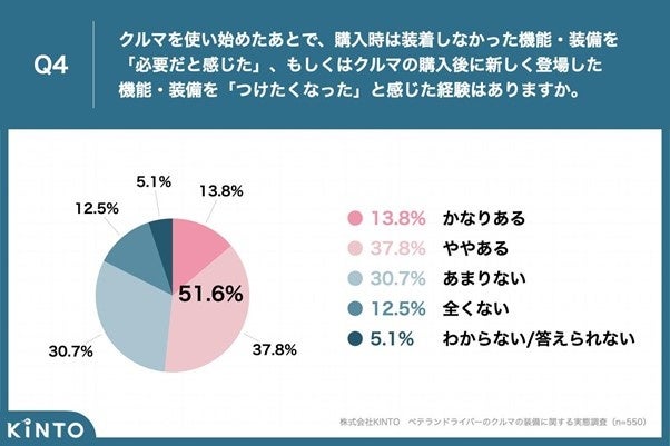 「Q4.クルマを使い始めたあとで、購入時は装着しなかった機能・装備を「必要だと感じた」、もしくはクルマの購入後に新しく登場した機能・装備を「つけたくなった」と感じた経験はありますか。」(n=550)と質問したところ、「かなりある」が13.8%、「ややある」が37.8%という回答となりました。