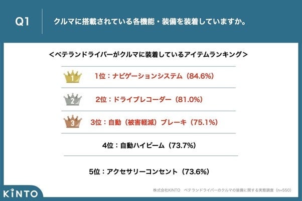 株式会社KINTO(本社:愛知県名古屋市、代表取締役社⻑:小寺 信也)は、過去5年以内に新車を購入した、運転歴10年以上のベテランドライバー550名を対象に、ベテランドライバーのクルマの装備に関する実態調査を実施しましたので、お知らせいたします。