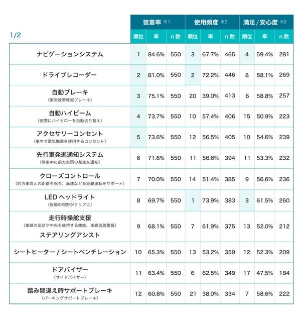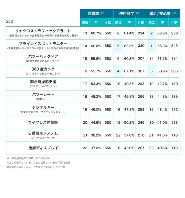 装着している装備について、実際の使用頻度・満足度/安心度を聞いたところ、「ブラインドスポットモニター」「リヤクロストラフィックアラート」「LEDヘッドライト」「360度カメラ」など装着率では高くなかったアイテムが上位にランクインし、装着している装備と実際に使用・満足している装備には一定のギャップが生じることがわかりました。