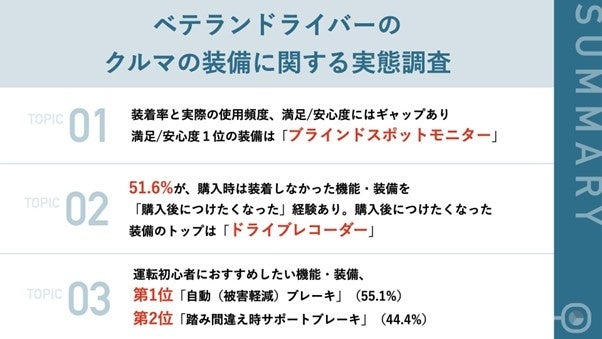 さらにベテランドライバーの51.6%が、購入時は装着しなかった機能・装備を「購入後につけたくなった」経験があり、半数のドライバーがカーライフを過ごす中で新たに装備が必要だと感じた経験があることが明らかになりました。