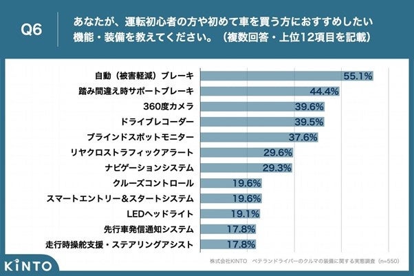 「Q5.あなたが、運転初心者の方や初めて車を買う方におすすめしたい機能・装備を教えてください。(複数回答)」(n=550)と質問したところ、「自動(被害軽減ブレーキ)」が55.1%、「踏み間違え時サポートブレーキ(パーキングサポートブレーキ)」が44.4%、「360度カメラ(パノラミックビューモニター)」が39.6%という回答となりました。