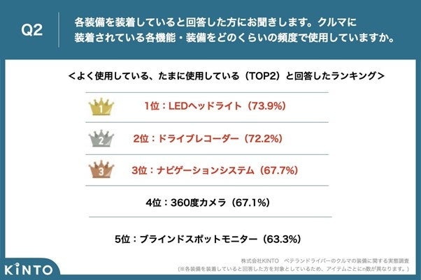 各装備を装着していると回答した方を対象に「Q2:クルマに装着されている各機能・装備をどのくらいの頻度で使用していますか。」と質問したところ、よく使用している、たまに使用している(TOP2※)と回答したランキングは以下の通りとなりました。
