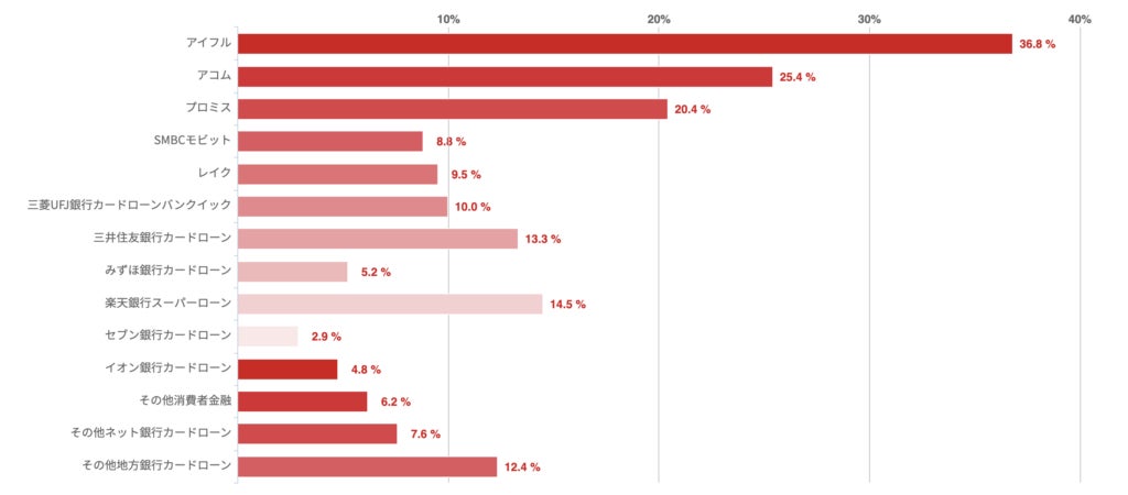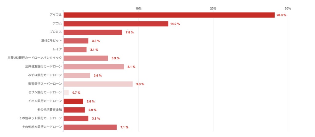アイフルが28.3%で最も多く、アコムが14%、楽天銀行スーパーローンが9.3%でこれに続いた。
