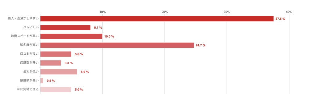 「借入・返済がしやすい」が37.5%で最も多く、「知名度が高い」が24.7%、「融資スピードが早い」が10%となった。