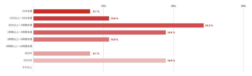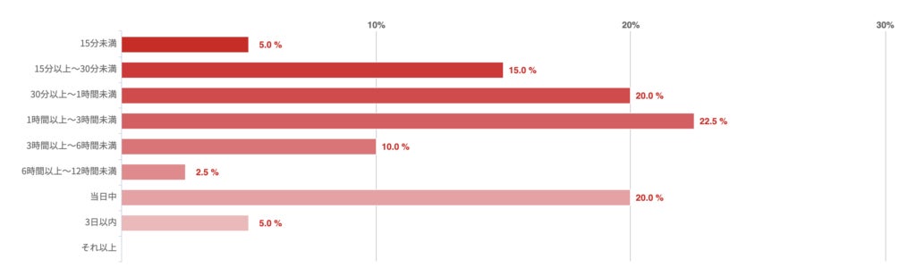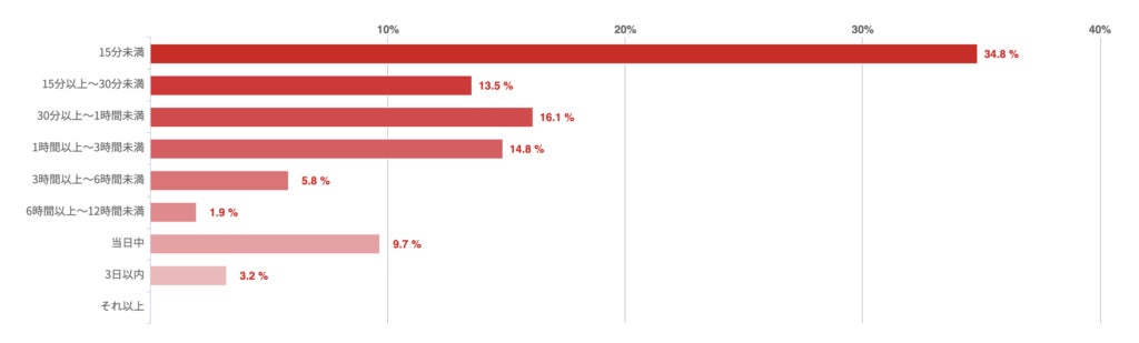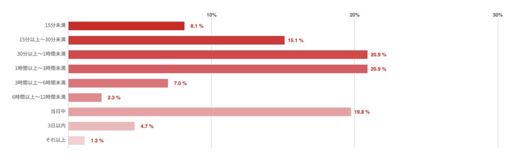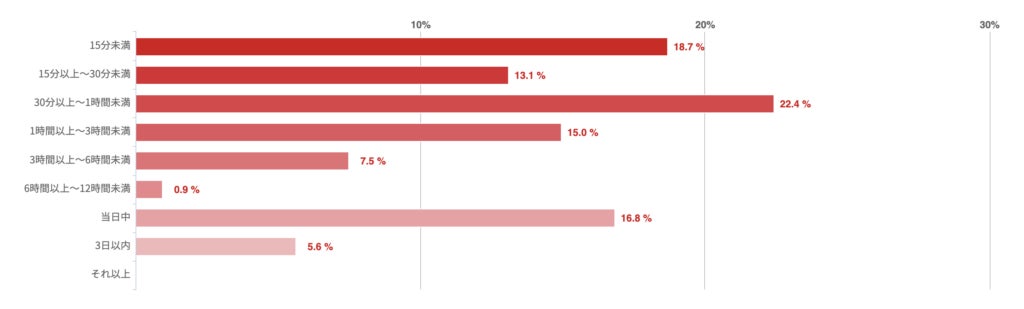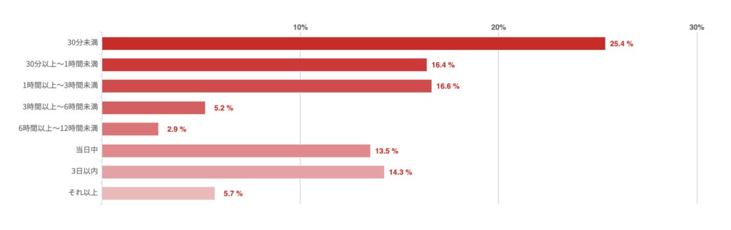 「30分未満」との回答が25.4%で最も多く、「30分以上〜1時間未満」「1時間以上〜3時間未満」はほぼ同数となった。一方、「3日以内」との回答も14.3%あった。