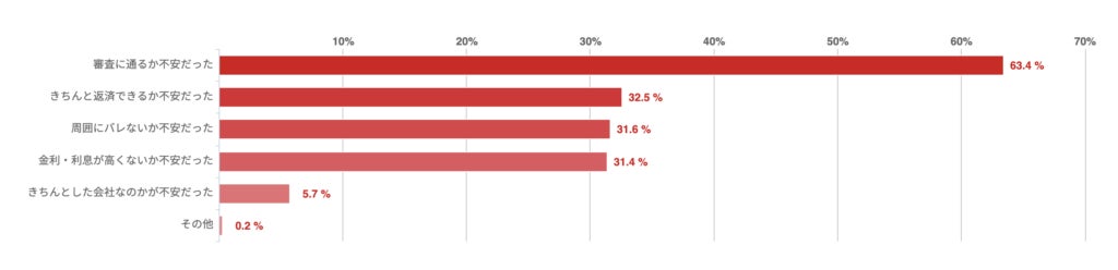 「審査に通るか不安だった」との回答が最も多く6割を超えた。その他、「きちんと返済できるか」「周囲にバレないか」「金利・利息が高くないか」がいずれも3割程度で並んだ。