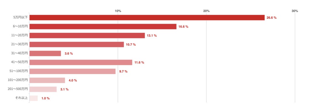 5万円以下の回答が26.6%で最も多く、「6〜10万円」が16.6%、「11〜20万円」が13.1%でこれに続いた。