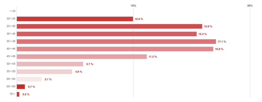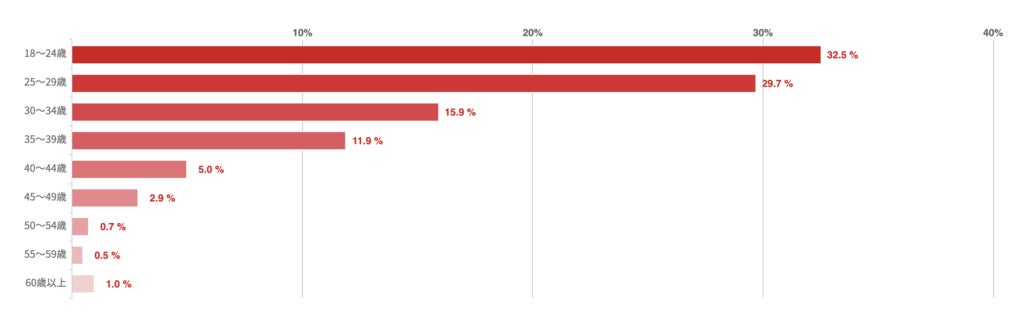 18〜24歳が32.5%で最も多く、25〜29歳が29.7%、30〜34歳が15.9%など、概ね年齢順に続く結果となった。