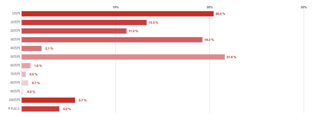 「50万円」が21.6%で最も多く、「5万円」が20.4%、「30万円」が19.2%でこれに続いた。