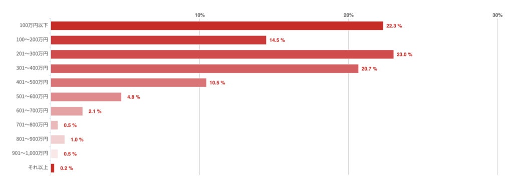 「201〜300万円」が23%で最も多かったが、100万円以下が22.3%、「301〜400万円」も20.7%とほぼ同数となった。