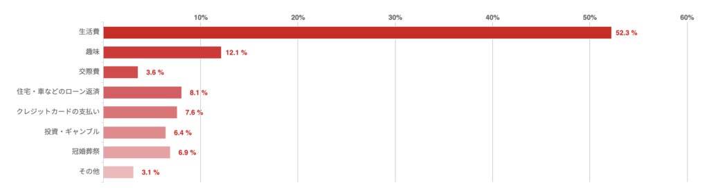 「生活費」との回答が52.3%と過半数を超え、「趣味」や「住宅・車などのローン返済」などがこれに続いた。