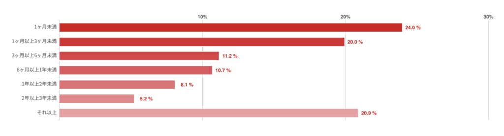 「1ヶ月未満」が24%で最も多かったが、「それ以上(3年以上)」との回答も20.9%とこれにせまる結果となった。その他、「1ヶ月以上3ヶ月未満」も20%と回答が多かった。