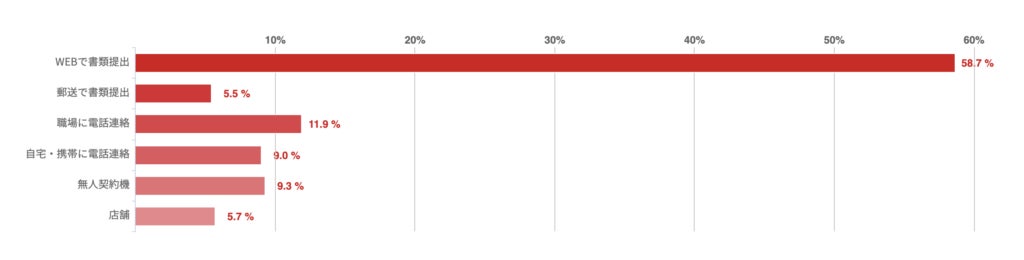 WEBで書類提出が58.7%で最も多く、圧倒的な割合を占めた。その他、職場に電話連絡が11.9%、無人契約機が9.3%などとなった。
