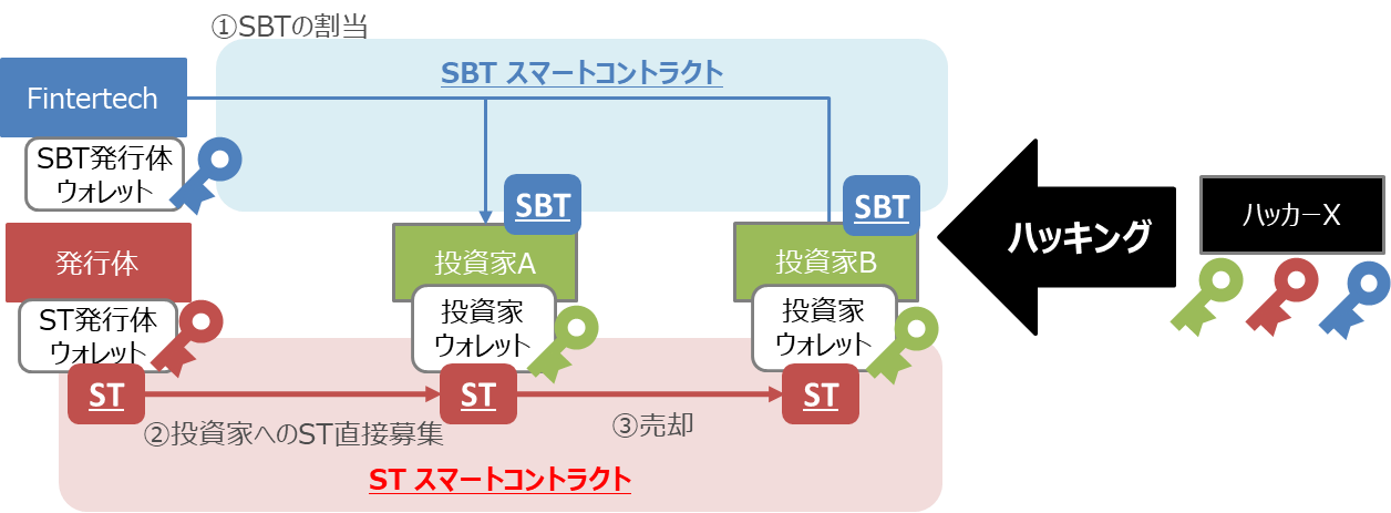 STのスマートコントラクトにより、当該STは、SBTが付与された投資家しか売却、取得できないよう設計されており、これによってハッキングによる秘密鍵の流出時にもSTの不正な移転ができないような設計としております。