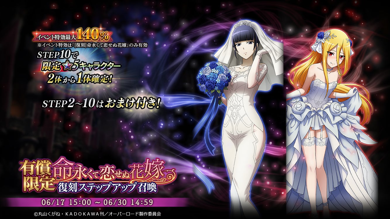 6/17よりイベント『[復刻]命永くて恋せぬ花嫁』を実施!イベント連動召喚『有償限定命永くて恋せぬ花嫁復刻ステップアップ召喚』では『【雷電の花嫁】ナーベラル』『【晶出の花嫁】イビルアイ』が復刻登場!