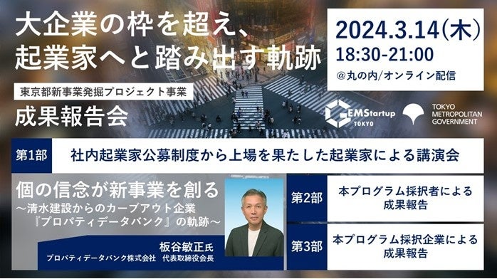 【東京都主催】革新は小さな一歩から~大企業の枠を超え、起業家へと踏み出す軌跡~「GEMStartup TOKYO」成果報告会、2024年3月14日(木)開催決定