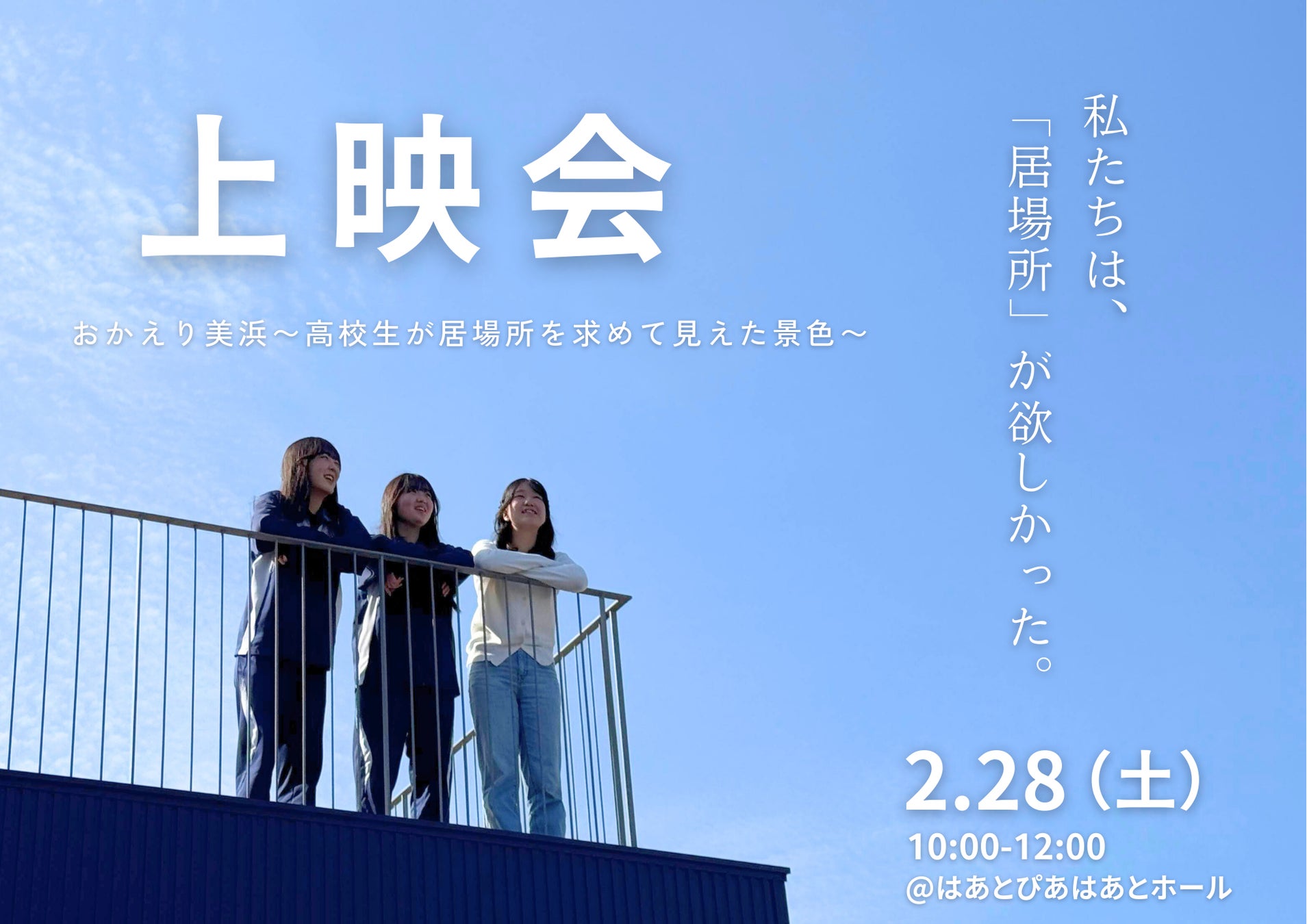 おかえり美浜実行委員会は2月28日(土)、ドキュメンタリー番組完成上映会「おかえり美浜〜高校生が居場所を求めて見えた景色〜」を開催いたします。