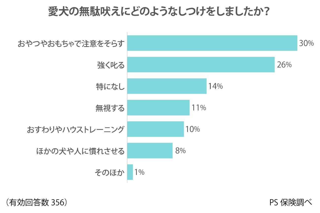 愛犬の無駄吠えに対するしつけの方法で最も多かったのは、「おやつやおもちゃで注意をそらす」でした(30%)。愛犬のお気に入りのものを目の前で見せて、おとなしくなったら渡すようにしましょう。その際には、愛犬をたくさん褒めてあげると効果的です。