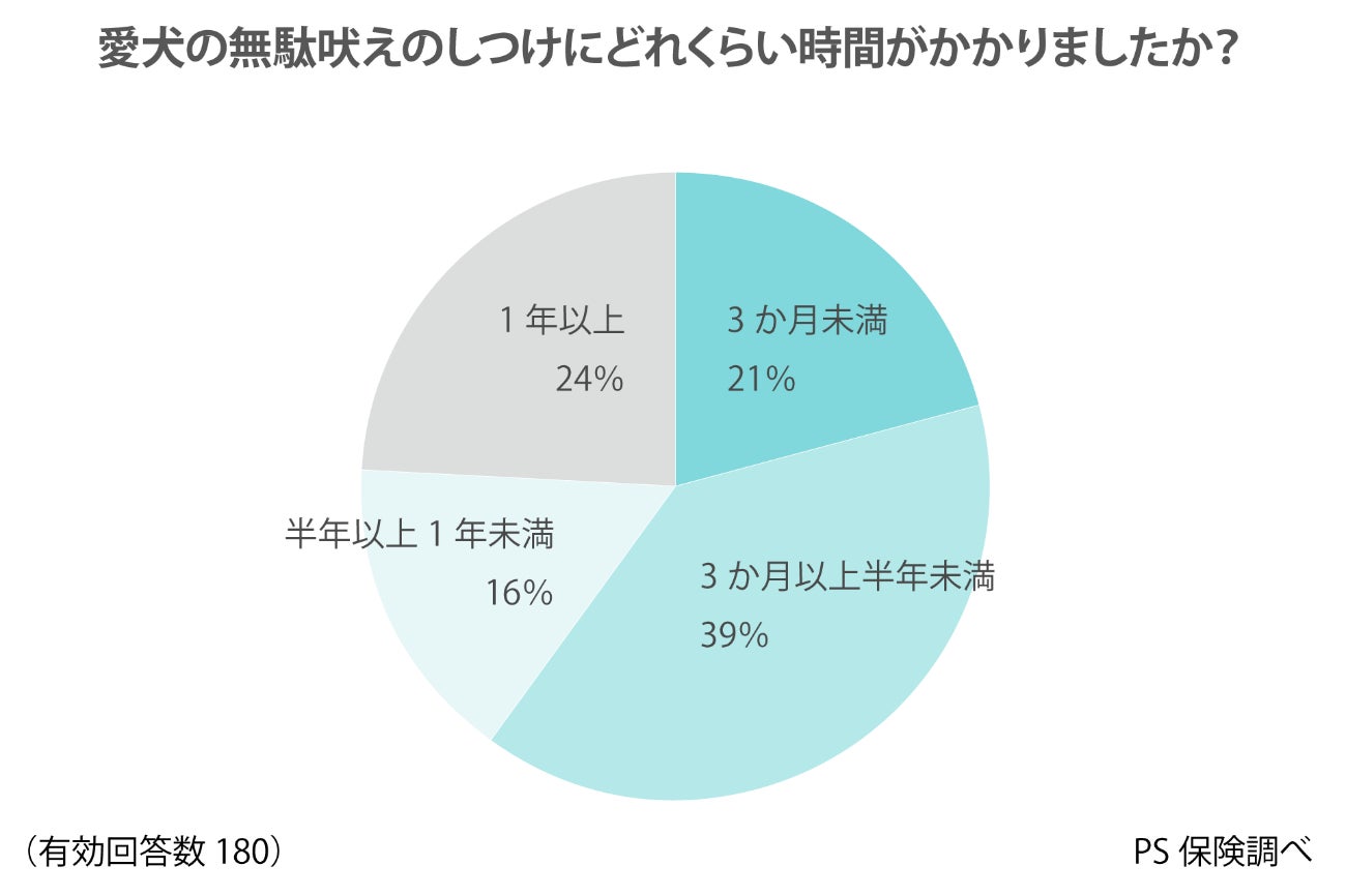 愛犬の吠える頻度が減ったという、しつけの効果が出るまでにかかった期間は「3か月以上半年未満」が最多でした(39%)。しかし、24%の飼い主は「1年以上」かかったと回答しており、辛抱強くじっくり取り組まなくてはならないケースもあるようです。