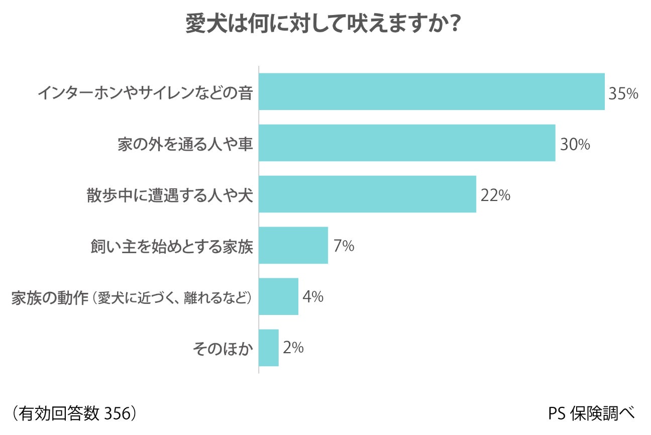 愛犬の無駄吠えに悩んだことのある飼い主の中で、最も多くの人が吠える対象として「インターホンやサイレンなどの音」を挙げました(35%)。次いで「家の外を通る人や車」(30%)、「散歩中に遭遇する人や犬」(22%)という回答が続いています。