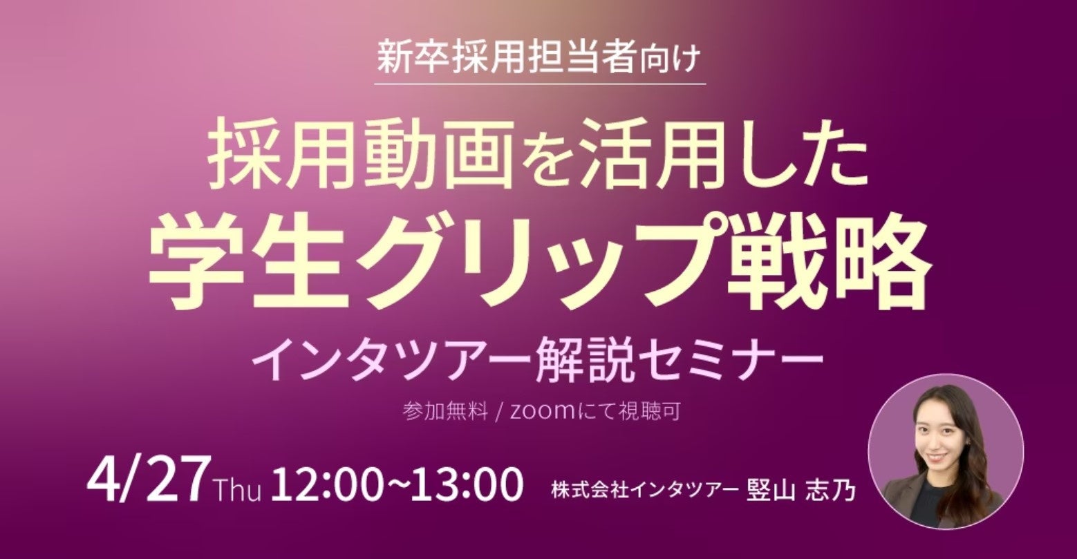「働く」に関する社会課題をビジネスで解決するキャムコムグループの、株式会社インタツアー(代表:作馬 誠大、本社:東京都港区浜松町)は、2023年4月27日(火)に、新卒採用担当者向けオンラインセミナー『採用動画を活用した学生グリップ戦略』を開催いたします。