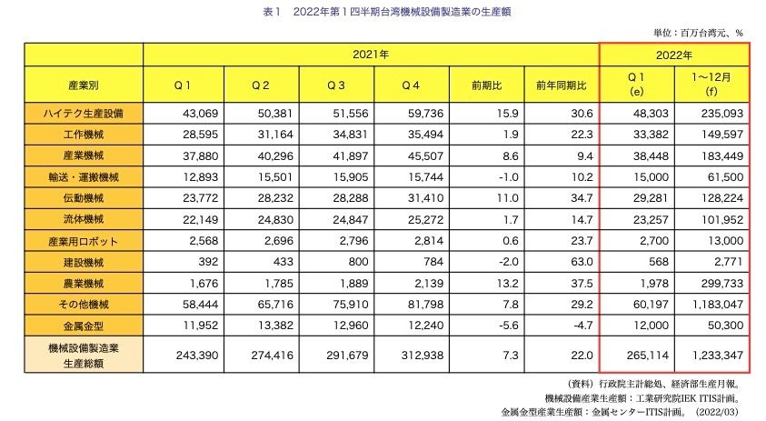 2022年第1四半期の台湾機械産業の生産額は2,651億1,500万台湾元で、2021年同期比は8.9%増だった。