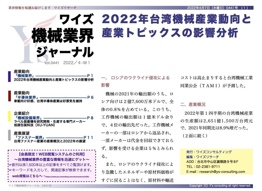 2022年台湾機械産業動向と産業トピックスの影響分析<ワイズ機械業界ジャーナル2022年4月第1週号発行>