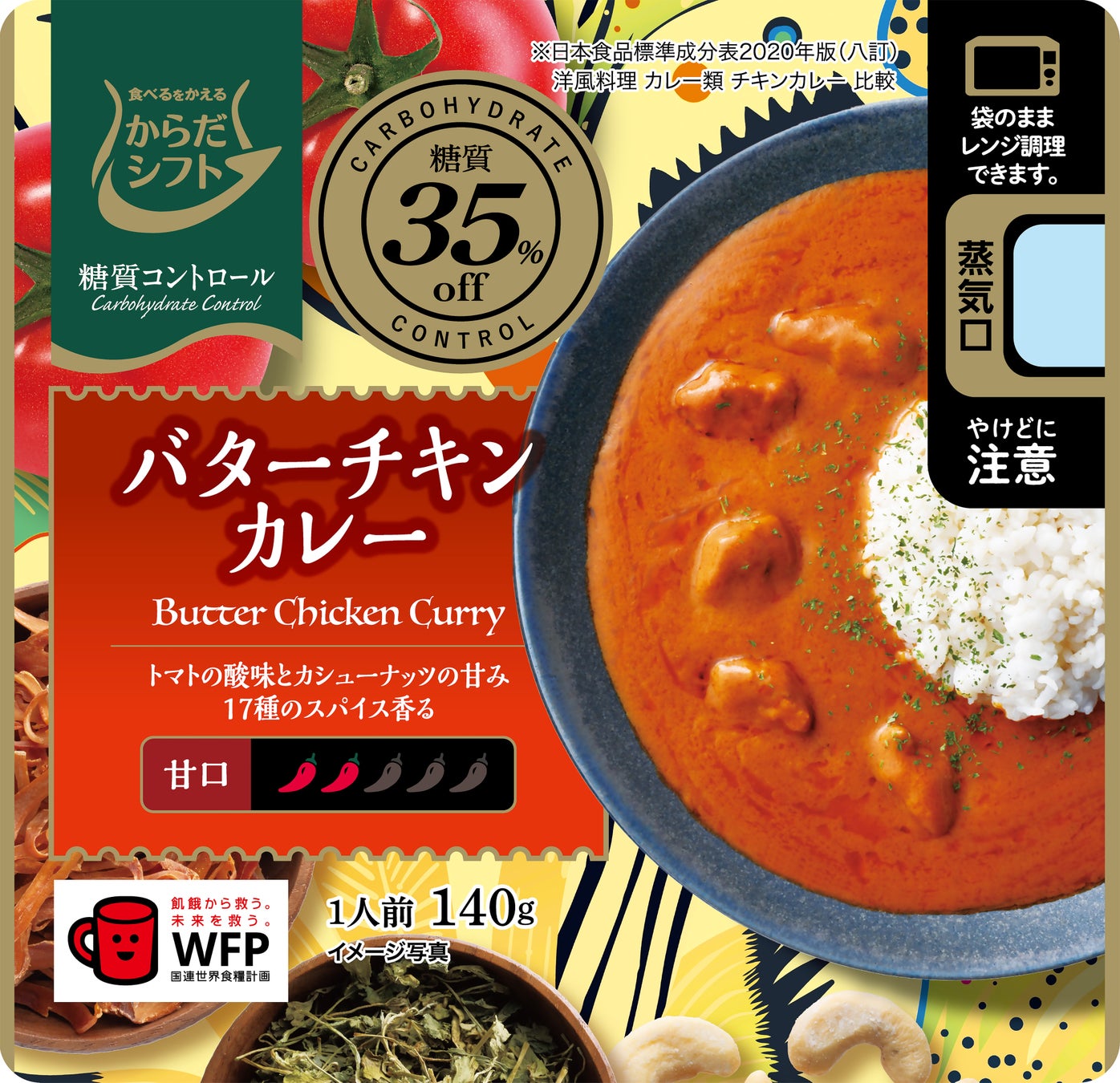17種類のスパイスを使用し、トマトの酸味とバターのコクのバランスにこだわり、インドカレーのような本格的なバターチキンカレーに仕上げました。糖質35%off(※)、1食(140g)当たりの糖質量を5.6gに抑えました。