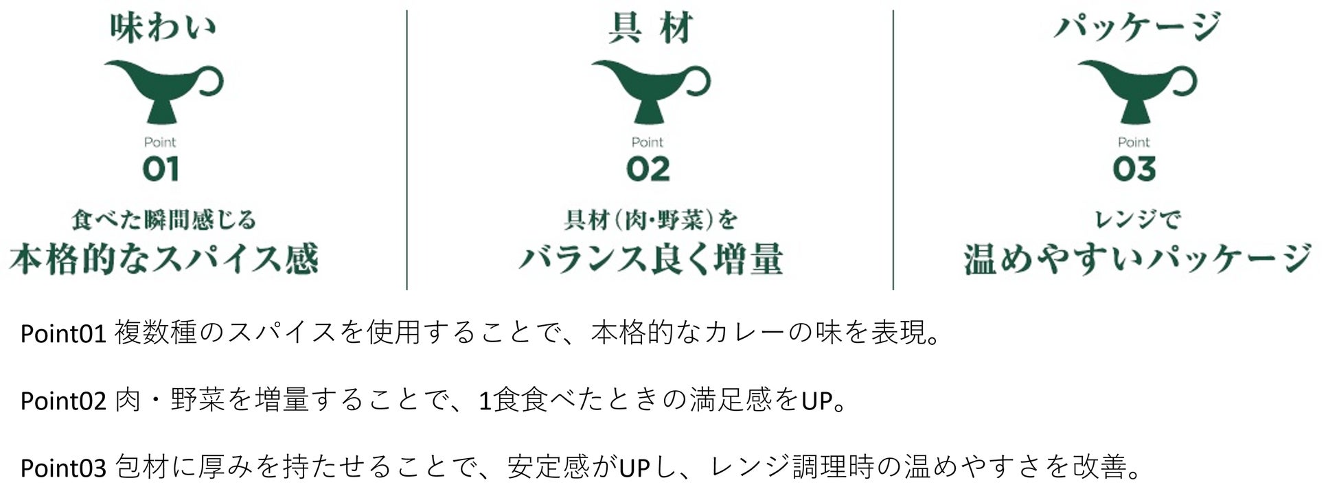17年9月の発売から7年目を迎える健康ブランド「からだシフト」。主力商品の1つである「糖質コントロール カレー(3SKU)」は、23年8月に環境配慮への一環として、外箱を無くしたスタンディングレンジパウチに変更しております。この度、『糖質コントロール カレー』の購入者調査を実施し、「スパイス感」「具材感」「パッケージ」のニーズを追求したカレーにリニューアル致しました。これまでの”糖質offなのにおいしい”から、“このおいしさで、糖質off”を目指す、本格的なカレーに生まれ変わりました。