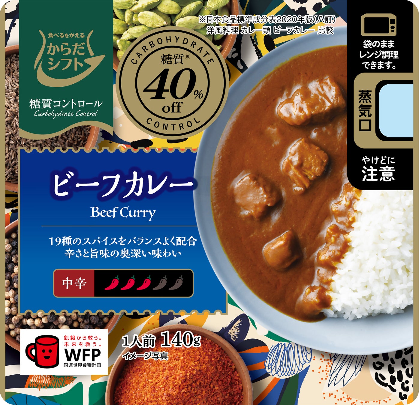 19種類のスパイスを使用し、口に入れた際に感じる旨味と辛みのバランスにこだわった、味わい豊かなビーフカレーに仕上げました。糖質40%off(※)、1食(140g)当たりの糖質量を4.2gに抑えました。
