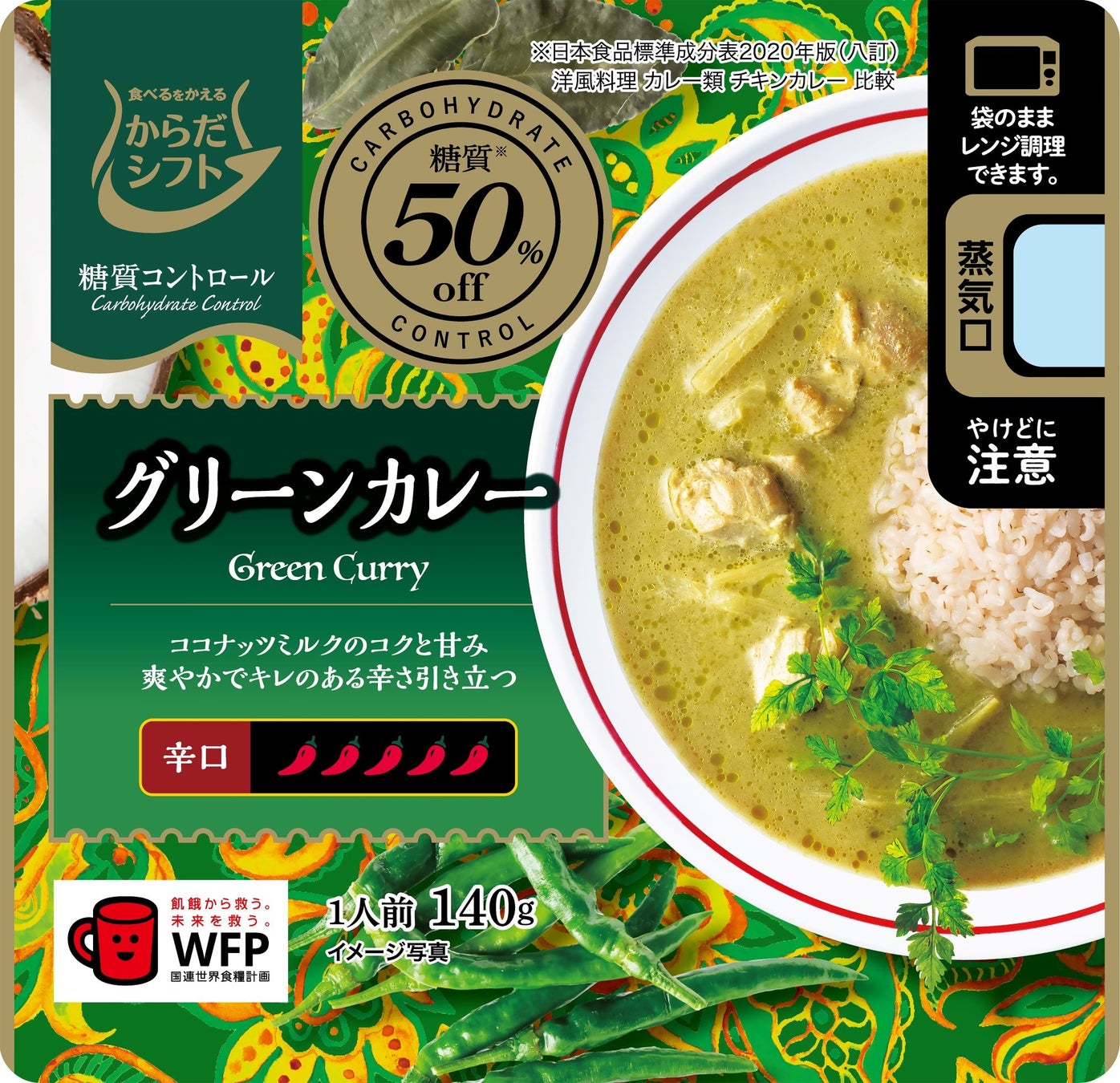 7種類のスパイスを使用し、ココナッツミルクの甘みとこぶみかんの葉(粉末)の酸味のバランスにこだわった、タイカレーのような本格的なグリーンカレーに仕上げました。糖質50%off(※)、1食(140g)当たりの糖質量を3.3gに抑えました。