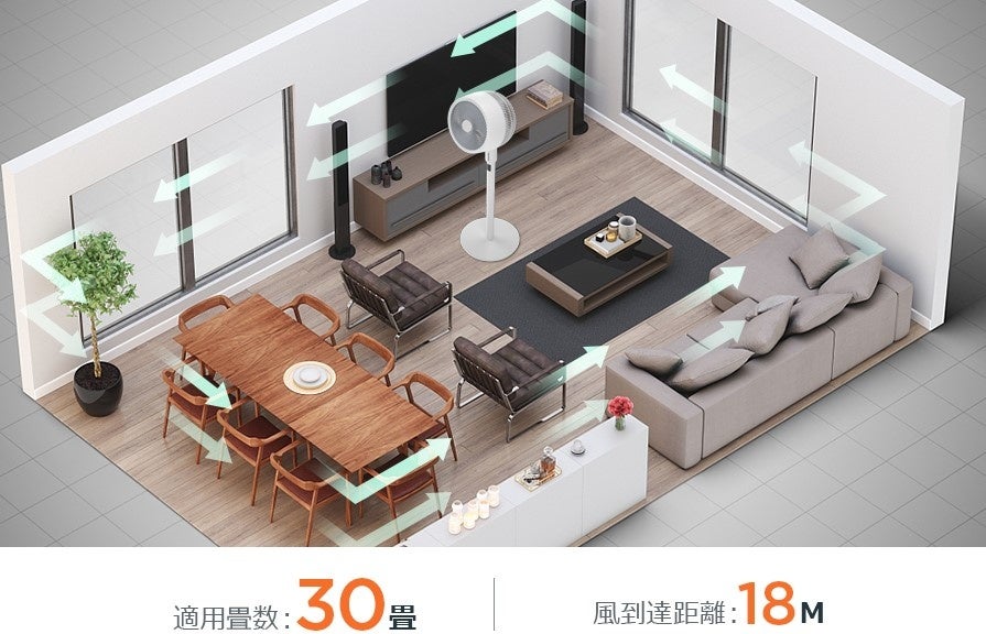 独自の研究と構造設計で空気の流れをコントロールし、より直進性の高い気流を作り出します。さらに、1690r/min回転速度・7.0m/s風速 のDCモーターを搭載することでよりパワフルの風を直線に集中させ、より遠くまで届けます。最大風力時の到達距離がMAX18mまで送風できます。