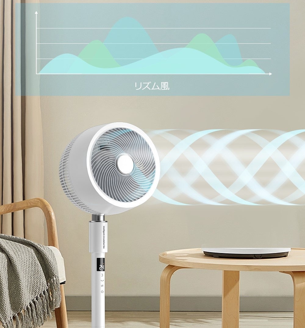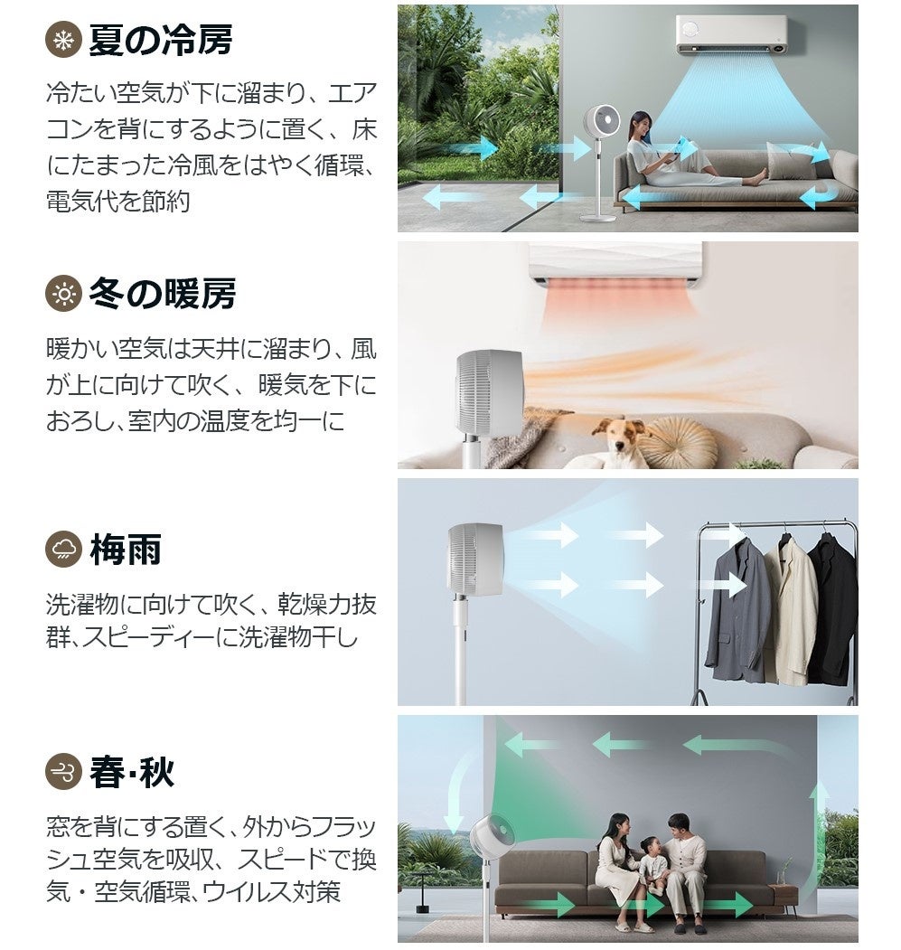 上下、左右に加えて、立体3D首振りができるので、風を部屋中に拡げて室温のムラを抑えます。お部屋全体の空気を攪拌させて循環気流を起こします。エアコンと併用すれば、より効率的な冷暖房が可能となります。