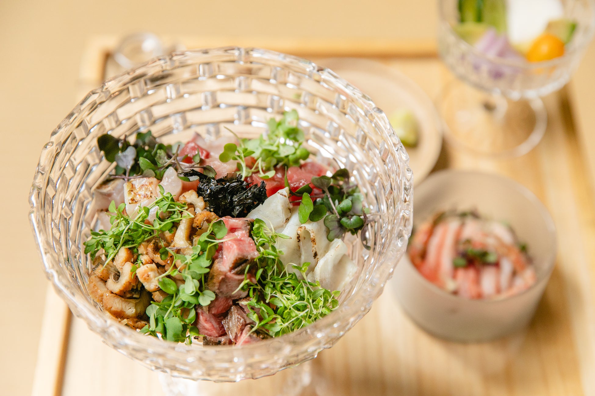 2021年3月にオープンした【 TILE (タイル) 】は、“伝統の再定義”をコンセプトとした、全く新しい価値観の「食」を楽しめる創作海鮮丼専門店。店名にもなっている通り、タイル型にカットされた食べやすくお箸を使わなくても良い約30種類の魚介類を中心としたネタと、薬味として位置付けているマイクログリーンを自由にレイアウトし、金沢薬味海鮮丼を美しい宝石箱に落とし込むという体験型レストランです。築110年の町屋を改装し、不特定多数の人を集めるのではない、クローズドで特別な空間を演出。2022年から2024年まで、世界最大の旅行プラットフォーム「トリップアドバイザー」より、優れたサービスを一貫して提供する施設に贈られる「トラベラーズチョイスアワード」を3年連続で受賞中。