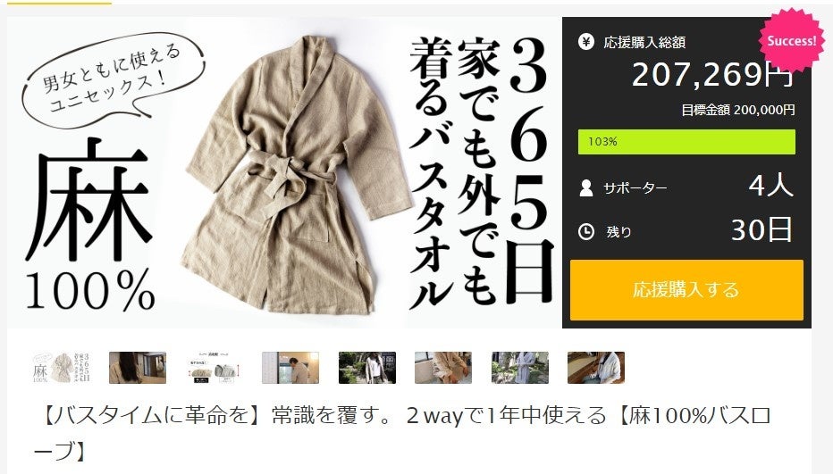アタラシイものや体験の応援購入サービス「Makuake(マクアケ)」にて開催中の【バスタイムに革命を】常識を覆す。2wayで1年中使える【麻100%バスローブ】プロジェクトが早くも目標金額達成!